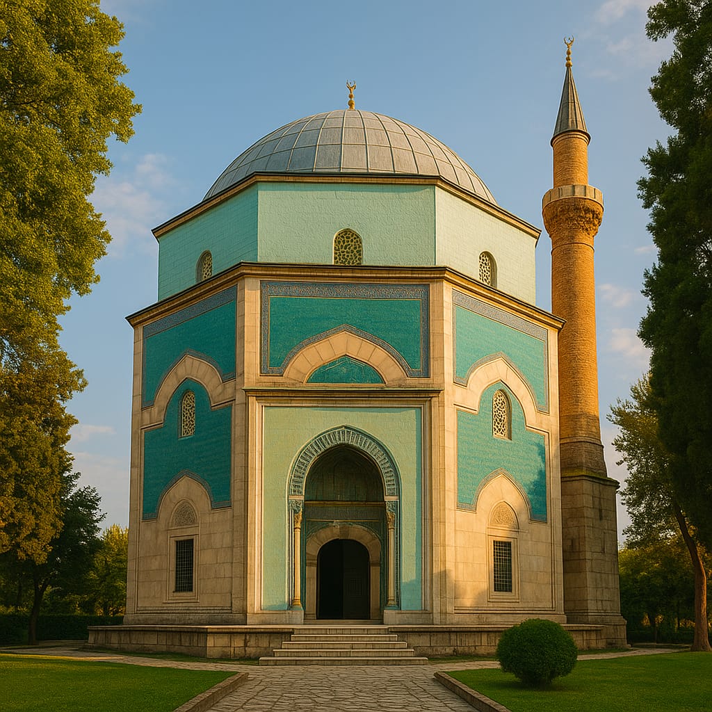 The mausoleum of Sultan Mehmed I, adorned with iconic turquoise tiles and surrounded by lush gardens.